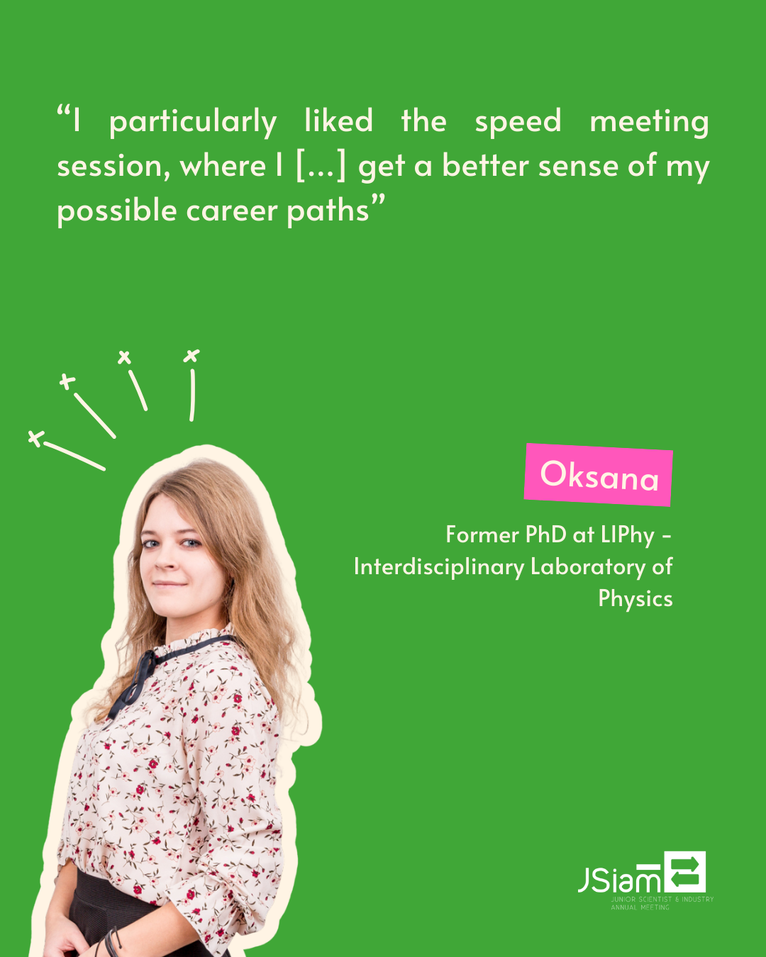 “JSiam is an exceptional opportunity to prepare for job search by PhD students and PostDocs. The wide offer of workshops with insights from recruiters, speed-dating with industrial representatives open to PhD graduates and a contest will fill your day – there is no time to get bored! You can meet other students to exchange experience and get in touch (sometimes for the first time) with industry, ask questions and drop off your CV. Definitely worth attending if you’re considering a career in industry!”